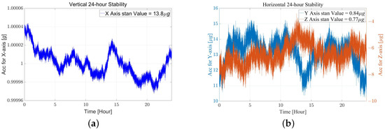 The 24-h bias stability test of the prototype with a gravitational loading of (a) vertical 1-g and (b) Horizontal 0-g, which is about 13.8 g (X), 0.84 g (Y), and 0.77 g (Z), respectively.