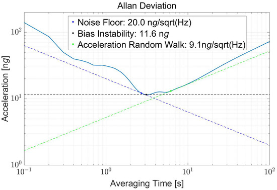 Allan deviation is the most universally used figure of merit in sensor technology to quantify the instability of a device. However, limited by the ADC sampling rate in the vertical direction, only the horizontal result is shown in Figure 10. The bias instability is about 11.6 ng@3s, and the noise floor is the same as Figure 8.