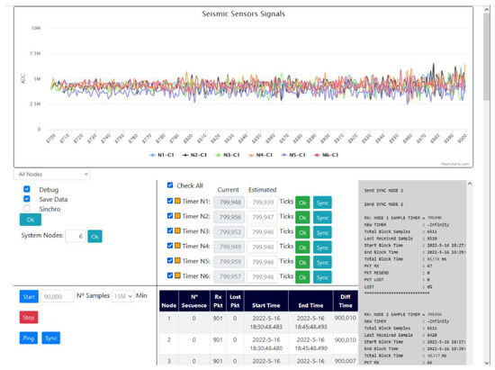 Some of the bases have been taken from a previous work carried out by the same authors [30]. In both works, point-to-multipoint topology is used. However, in the proposed system, all nodes share the same Wi-Fi network, unlike what happens in [30]. It has led us to implement an exclusive mechanism based on transmission time slots so that each node transmits without causing a collision. Otherwise, all nodes would transmit at the same instants of time since they are synchronized. The types of messages used for communication are very similar to [30], although their structure is different, and some new ones have also been added. Regarding the synchronization, it has been improved, reducing the maximum deviation to a quarter of that achieved in [30]. Finally, the user interface template used in [30] has been used as a starting point for the current one, although it has been improved with additional setup commands. Besides, the data visualization is automatically adapted to show signals from vertical or three-component sensors.