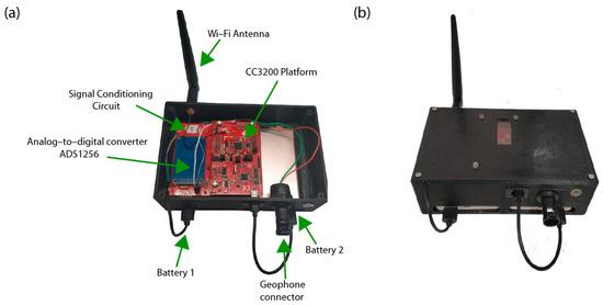 In the work of Soler-Llorens et al. [33], a network of wireless sensors (or nodes) is established using the Zigbee communication protocol to manage the acquisition of seismic signals and the synchronization between the measurements of each sensor. The data are collected locally on each node, so the main drawback is that you have to remove the memory cards from each node and access the files one by one. In addition, this system does not allow the visualization of the signals in real time, which prevents problems associated with the malfunction of a geophone or errors in the connections from being detected in situ in the field.