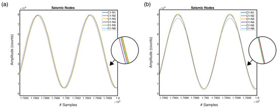 - The designed prototype performs from small measurements of short duration (e.g., 5–10 min) to continuous measurements. For long records (e.g., longer than 1 h), it is important to note that if the nodes are not properly synchronized, the recorded signals will become increasingly out of phase, as the record is longer due to the poor quality of the quartz crystal that the microcontrollers contain, which generates a time drift of the internal clock. For this reason, we make a special mention of the synchronization module which is based on the PTP protocol (Precision Time Protocol).