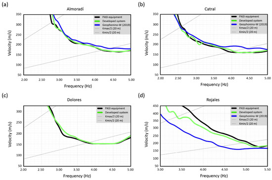 For Geophonino-W [33], the array measurements were taken in another place near the study site. The available free area conditioned the site and the array layout. Thus, the ten 1 Hz sensors were distributed around an ellipsoidal-shaped geometry with a major radius of 43 m and a minor radius of 26 m. According to that, the valid frequency range was 3–8 Hz. In this case, the comparison of the Geophonino-W dispersion curve [33] with the other two shows a greater deviation than that obtained for the rest of the sites (i.e., Almoradí and Catral). These discrepancies could be due to the fact that the measurements were not taken exactly in the same place, and, therefore, the characteristics of the soil could be somewhat different. Moreover, the observed variation could be within the error ranges established by the corresponding standard deviation of the estimated curves.