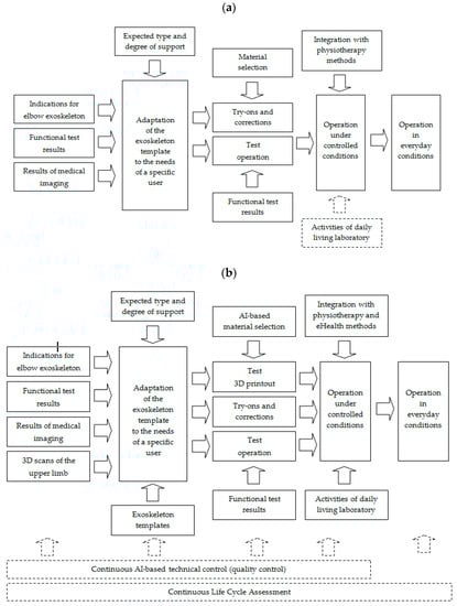 The comparison between the current situation and the proposed solution covered by this study is shown in Figure 1. The proposed concept includes not only an increase in the use of AI for the selection of materials and exoskeleton fabrication technology, but also a comprehensive technical control and product life cycle analysis (LCA).