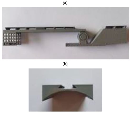 Strength test samples—parts of the exoskeleton for the elbow joint: (a) lever (five samples), (b) cap (four samples).