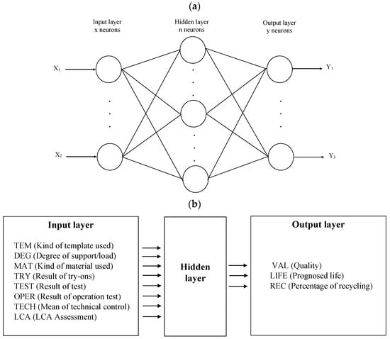 The MLP network was chosen based on the authors’ knowledge, previous research, and experience. The MLP network has a three-layer structure: an input layer, a hidden layer, and an output layer (Figure 5). Eight neurons were placed in the input layer, each corresponding to one parameter value from Figure 1b. Three neurons were placed in the output layer, each of which corresponded to one of the three parameters corresponding to product quality, predicted durability, and recyclability. The number of neurons in the hidden layer was first estimated based on the authors’ previous knowledge and experience, followed by an experimental analysis of the most likely MLP network structures. The MSE values, the transition functions, and the results for the most probable MLP networks are presented in Section 3–Results. It follows, as discussed later in the paper, that the best results were achieved with an MLP 8-10-3 network, which is an MLP network with 8 neurons in the input layer, 10 neurons in the hidden layer, and 3 neurons in the output layer. Values of TEM, DEG, and MAT were assessed by the experiment described later in this article. Values of TRY, TEST, OPER, and TECH were submitted by sensors or human action (e.g., manually by physiotherapist) after finishing subsequent phases of the designing process from Figure 1b. LCA assessment was calculated using a simple tool (OpenLCA, https://www.openlca.org, accessed on 15 June 2022), but many diverse tools may be used here, beginning with LCA Calculator, Eco Indicator 99, Eco Scan 3.0, or Eco-IT through OpenLCA to advanced SimaPro, GaBior Umberto analysis. OpenLCA has been used in many studies thus far (https://www.openlca.org/openlca-publications-research/ (accessed on 15 June 2022)).