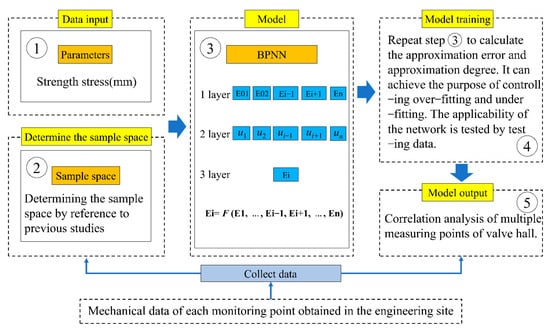 The research process of a BPNN for the multiple-measuring-point mechanical property correlation model of valve hall grid members is shown in Figure 1. Initially, the mechanical property data of each monitoring point of the valve hall grid members were obtained according to the on-site monitoring. Then, the mechanical data of n − 1 multiple measuring points were taken as the input variable of the BPNN, and the mechanical data of another measuring point were taken as a group of output variables. From this, n training sample spaces of the BPNN were constructed. We input the data parameters into the BPNN for training. Each training sample space was iterated many times to make the convergence error reach the set value and determine the parameters of the neural network. After the model training, we calculated the relative error between the measured value and the predicted value of the mechanical data of each member of the valve hall grid, and then checked the correctness of the model. Finally, the correlation of mechanical properties of multiple measuring points and the overall safety form results of the valve hall grid hoisting project were obtained through the model.