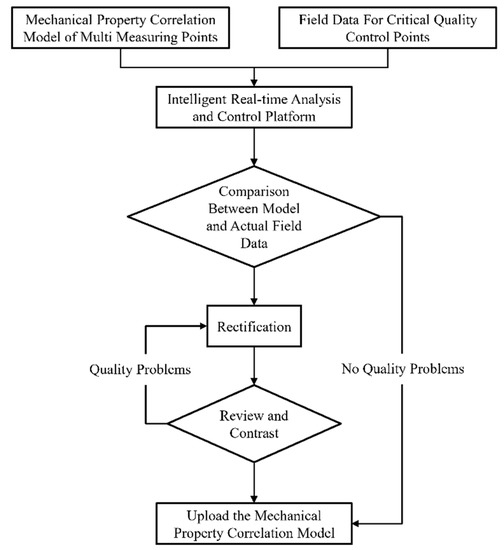 Combined with our team’s previous research results and practical engineering experience [26,27], the multidisciplinary data management and application technology of valve hall engineering based on microservice architecture can improve the management efficiency of engineering data. Through the multiple-measuring-point mechanical property correlation model of the members, the correlation between the members in the grid structure of the valve hall project is established without increasing the amount of model data required. The correlation effect of the model is evaluated by the determination coefficient in Equation (7). Based on this, the intelligent real-time analysis system (Figure 3) for the mechanical properties of members is established to effectively manage and apply the mechanical properties of each member in real-time. In addition, we can click a steel node or steel member in the model through the intelligent real-time analysis system to obtain its specific state. By displaying and analyzing the three-dimensional model, the construction progress of grid frame hoisting can be controlled and decided. The main intelligent real-time analysis and control processes are shown in Figure 4.