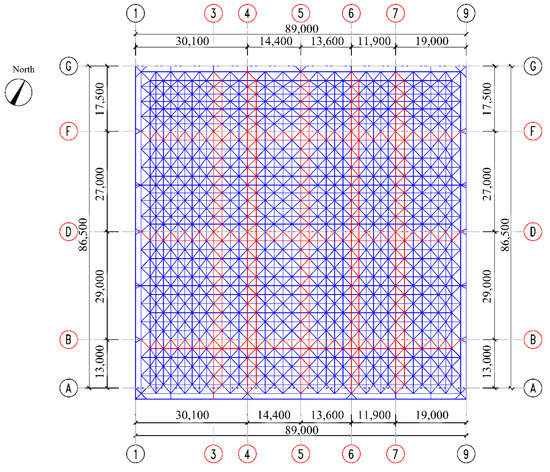 To test the performance of the above multiple-measuring-point mechanical property correlation model and the application effect of the intelligent real-time analysis system, the high-end valve hall of a converter station in South China was used as the test bench in this paper (Figure 5). The high-end valve hall was a steel structure with a maximum installation elevation of +43.971 m. The grid structure of a high-end valve hall was processed and pre-arched, with a value of 0.1 m. The lifting area was a roof grid structure, which adopts hydraulic lifting. The lifting range was between the 1~9 axis and the A~G axis of the structure. The maximum span of the structure was 89.0 m, and its height was 8.471 m. The lifting height was about 35.5 m, and the lifting weight was 733 t. Stress observations were carried out at the four stages of member installation, hoisting 0.5 m, hoisting 15 m, and hoisting to the top before hoisting the valve hall. As shown in Figure 6 and Figure 7, the monitoring points were set at axis 3~7 and axis B~F of the valve hall structure. Figure 6 is the vertical view of the monitoring point layout, while Figure 7 represents the sectional view. A total of 30 monitoring points were arranged along the axis of the valve hall, and the monitoring point numbers were E001–E030.