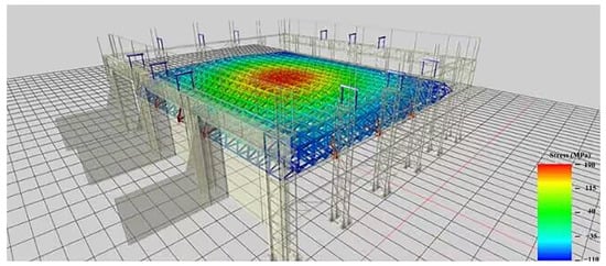 For the super-span valve hall, because of its huge volume, the stress state of the structure itself needs to be considered during the construction and hoisting. Therefore, in the process of hoisting the valve hall grid structure, the analysis of the mechanical properties of the members is of great significance for evaluating the quality and safety of the project [21,22]. Monitoring the stress performance of the whole hoisting process of the super-span valve hall grid structure can help us to better grasp the stress situation of the structure and ensure smooth construction.