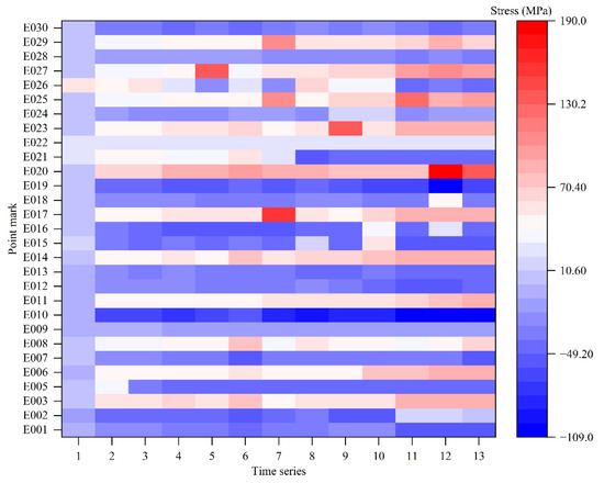 The monitoring points were monitored along with the gradual hoisting of the valve hall grid structure. To ensure the reliability and continuity of the monitoring data, the damage point E004 was eliminated in advance. The intelligent real-time analysis system, based on the mechanical properties of the members in the whole hoisting process of the grid structure, collected the monitoring data (Figure 8). This test was based on 13 time series data points from four stages of member stress monitoring data obtained at key monitoring points (E001, E002, E003, and E005–E030) (Figure 9). Figure 9 shows the change in stress values at each monitoring point in the time series. We can measure the stress value by color. The monitoring stress of the series (E002, E003, and E005–E030) was used as the input data to predict the stress of E001. Then, the stress of the series (E001, E003, and E005–E030) was used as the input data to predict the stress of E002. The process was completed by analogy until 29 model training samples were established.