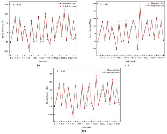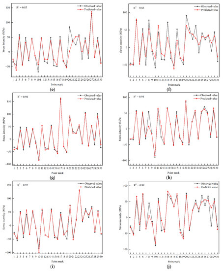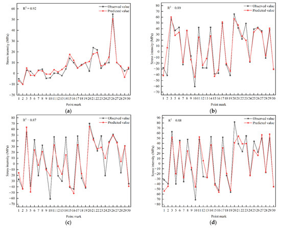 It can be seen from the curve comparison that the curve change rules of the training results are basically consistent with the measured curves (Figure 10), including the different laws for measuring stress in different periods. This shows that the selection of the input layer factor and the mechanical property correlation model of the multiple measuring points in this paper achieved the expected good results (R2 = 0.85–0.98). It indicates that the multiple-measuring-point mechanical property correlation model can fully explore the mechanical correlation mechanism and mechanical change rules contained in each member and has high prediction and fitting accuracy.