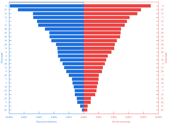 Finally, the contribution of each member node to the mechanical impact of monitoring point E030 under normal and abnormal conditions was obtained. This served to compare the contribution of theoretical conditions (mechanical data under numerical simulation) and actual conditions (mechanical data under on-site monitoring) to the mechanical properties of E030.