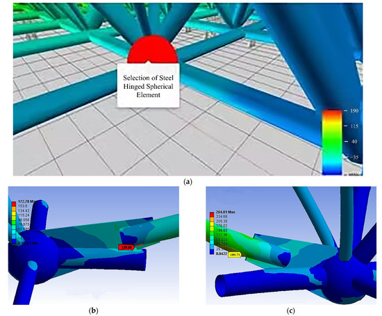 (a) Schematic diagram for the selection of the steel hinged spherical element; (b) stress inspection of member 17; (c) stress inspection of member 20.