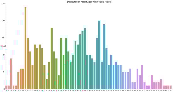 The data in our work are sourced from the Temple University abnormal dataset (TUAB). The goal is to predict the brain ages of those with histories of neurodegenerative diseases using raw EEG signals, with the focus on seizure patients due to the prevalence of those with seizure history in the dataset. A total of 564 patients in the TUAB dataset have a history of seizure or were tested for seizure activity. The TUAB dataset includes EEG signals recorded from patients of varying ages, from as young as 2 years of age to as old as 88. The average age of the patients in the recorded EEG signals utilized is 42 years of age (Figure 1).