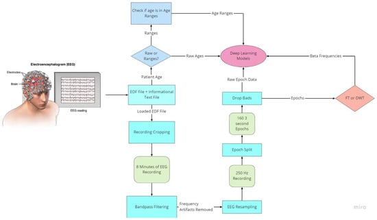 All the data utilized in this research originate from patients that have a history of seizures, either recently in life or those that have been seizure-free for any number of years. Many related works have obtained a personal database that had been personally gathered themselves or utilized a publicly available database of less varied recording ages and recording years. This process was not undertaken in this research due to a desire for the accessibility of anonymized patient information. While there are other publicly available EEG databases, such as the Boston Children’s Hospital database, they often do not contain the patients’ age information, are focused on a subset of younger demographic patients, or contain a very small subset of patient signals that would restrict model efficiency. The exploration of further preprocessing methods may be a way to further the accuracy of the employed models. While preliminary steps through FFT and DWT have been explored, the underwhelming results concerned the work on the raw EEG data and the power of the LSTM and GRU model architectures. Kaushik et al. [] reports that beta brain waves are the best for age classification in their research utilizing 60 patient brain waves split into six age categories ranging from 6 years of age to 55 years of age. As such, an evaluation of other frequency bands or a combination of those bands could lead to better age classification or age prediction results for patients with seizure history. The use and further exploration of the effect of signal extraction or signal-preprocessing techniques remains to be undertaken With this, however, the employed deep learning architectures in combination with the EEG brain signal-processing methods undertaken allowed for an outcome of desirable results when attempting to predict or classify a patient’s age based on their brain signals. There may not be a need for more elaborate signal processing than is typically anticipated, as a simple band pass filter is sufficient for obtaining a desired frequency band, so long as the results obtained are similar or better than its contemporaries.