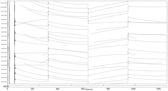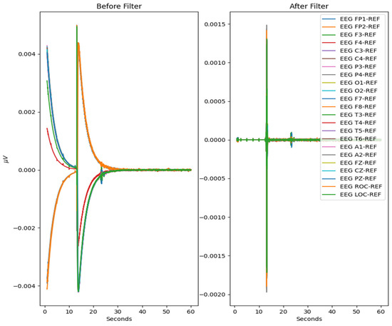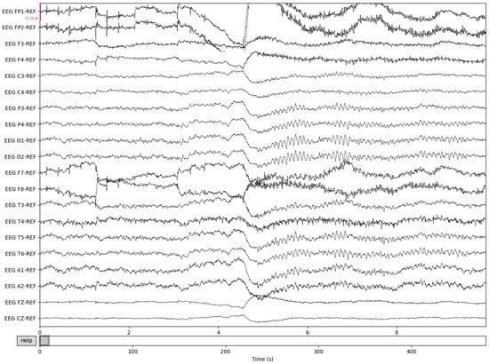 The process is visualized through series of figures. The start illustrated in Figure 4 shows EEG recordings taken directly from the EDF files versus the post-cropping, filtering, and resampling from the dataset (Figure 5) of a 34-year-old man with histories of seizures. Each line represents one of the EEG recording nodes from the dataset and its signal over time measured in microvolts. Figure 4 displays the main reasoning for the cropping of the EEG recording time to 8-minute sections starting from the first 60 s, as the large, almost flatlined recordings of EEG signals had to be removed to ensure that they did not impede further processing. These large, flatlined recordings primarily appear in the first 60 s of the EEG recording process and after which the signals stabilized into what could be viewed as a normal EEG recording. Such recording blocks are a subject of debate with respect to their origin, as they could originate from human error when placing the EEG nodes on the subject’s scalp, the subject having their eyes open to stimuli in the initial stages of recording, or simply as a byproduct of the recording mechanism. The signal recordings resulting from the initial resampling and cropping can be seen in Figure 5, yielding what can be seen as a more normalized EEG recording.