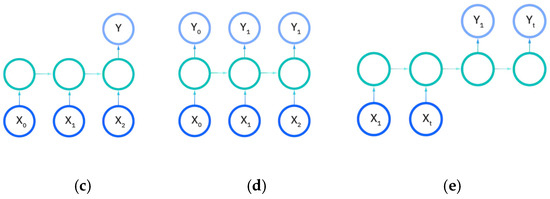 Input and output dimensions in RNN: (a) One-to-One; (b) One-to-Many; (c) Many-to-one; (d) Many-to-many; (e) Many-to-many (future prediction) [].