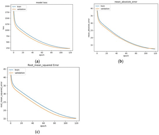 The LSTM model’s performance is illustrated in Figure 14a–c, showing convergence around epoch 120 before early stopping occurs (Figure 14a). The curve of the data suggests that the model fits well for the input data (Figure 14b). The RMSE of the model after training is 15.1 (Figure 14c). This is a basic version of an LSTM model that can be commonly seen across deep learning resources, and as such, is implemented and trained for the evaluation of the other models as a benchmark.