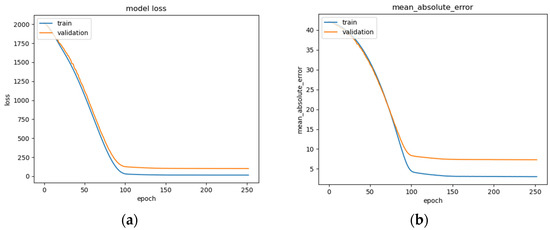 The tested models can be organized into two distinct sections: those utilizing two basic layers of LSTM or GRU, and bidirectional layered models utilizing batch normalization. All the models are trained over 500 epochs, with a learning rate of 1 × 10−5, and a batch size of 256 to maximize the use of the GPU. These hyperparameters are chosen to form a basis for the deep learning models’ evaluations, ensuring that all the models can be compared under the same circumstances. These larger learning rates and batch sizes are utilized to make the most out of the batch normalization layers. Learning rate decay and early stopping are employed to stop the model from stagnating during training. Learning rate decay is activated after the deep learning model has begun to plateau in terms of learning the information given. After three epochs, if the model training accuracy or MAE have not shown positive performance, the deep learning model architecture will decrease the learning rate further down by half of the current rate. This continues until early stopping activates. Early stopping evaluates the models’ proficiency after five epochs, monitoring the validation loss of the model-training parameters. After five epochs, the model will cease its learning and the resulting deep learning model will be saved. While GRU and bi-directional GRU models have been researched, due to a lack of significant gains in accuracy, these models are not included in the discussion.