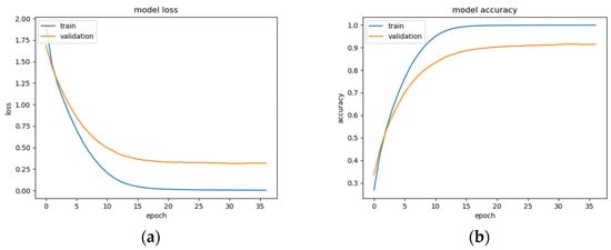 BLSTM model performance: (a) Categorical cross-entropy loss of the utilized BLSTM model on the raw EEG data; (b) categorical accuracy of the utilized BLSTM model on the raw EEG data.