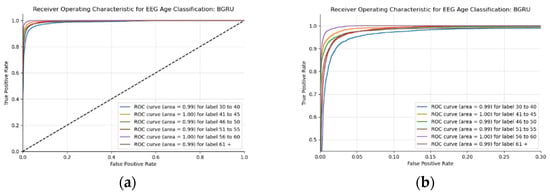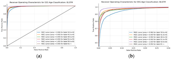 This BLSTM model employed in this experiment records an accuracy of 91% validation accuracy over 35 epochs of training, achieving F1 and precision scores of 0.9, using the same hyperparameters from other tests. Though the graphs in Figure 16 show that overfitting to the training dataset does occur, there is no drastic increase in the training loss and subsequent accuracy measures. Figure 16a presents the model loss and Figure 16b illustrates the model accuracy. The possible explanations for the displayed overfitting include that the regularization and generalization techniques, dropout, and batch normalization utilized to counteract overfitting were not employed during the validation set’s testing by default. Figure 17a,b display the ROC curves of the employed BLSTM model with Figure 17b showing magnified details in the range of a 0–0.3 false positive rate. These figures display that the BLSTM model is excellent at discriminating between the six given age ranges, with variable AUC scores in the upper 90%. The employed BLSTM model can discriminate between the upper age range of 61+, with a much lower ability to classify the 30–40 age range. The BGRU’s ROC curves displayed in Figure 18a,b showcase the slightly higher discriminating ability of the employed BGRU model, which has a better ability to classify the lower 30–40 age range.