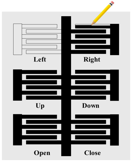 The IDC sensor was designed in MS Word by optimizing parameters such as the length, width, number of sensor fringes, and gap between the fringes. The optimization parameters involve the number of electrode fingers, finger width, finger overlap length, and spacing between the electrode fingers. The designed single sensors were arranged in an array of six to make an IDC sensor-based touch keypad. The designed keypad was printed on an A4 printer paper using an HP printer. A graphite-on-paper (GOP)-based manual fabrication process was used to fill the hollow IDC touch sensors, as shown in Figure 1. The first layer of the graphite was filled in the printed pattern in one direction and the results were tested. The results obtained from the sensors after the first layer were unreliable and non-repetitive because the graphite layer was inconsistent and had empty spaces on the surface. Consistency in the electric properties of the graphite and thus the sensor’s working was achieved through deposition of the graphite layers in different directions. The next layer of the GOP was deposited perpendicular to the first layer. Six layers of graphite were deposited in the same way in different directions, achieving uniform results from the sensors.