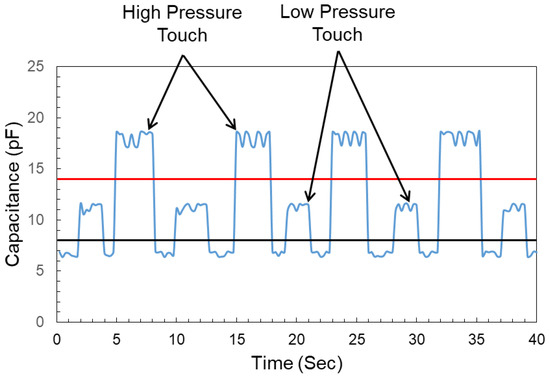 Capacitive touch sensors were utilized in this work because of their high repeatability, sensitivity, and low cost in developing CPS, keypad-based HMIs. Each keypad sensor consists of six fingers of 20 mm in length and 2 mm in width. The spacing between the fingers is 1 mm. All the keypad sensors were tested rigorously to no touch, low-force touch, and high-force touch to decide the thresholds for all three conditions. The change in the capacitance with low- and high-force touches was differentiable in comparison with the no-touch condition. The lines at 8 pF and 14 pF show the threshold to register the low-force touch and high-force touch consecutively. A single sensor response towards no-touch, low-pressure touch, and high-pressure touch is shown in Figure 3.