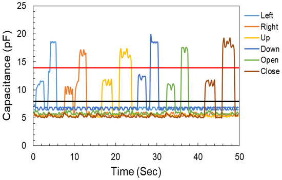 Six sensors were arrayed in a sequence to design a keypad, as shown in Figure 1. The arrayed sensors were named according to the respective controls of the robotic arm: the Left and Right sensors controlled the left/right movements of the base of the robotic arm; Up and Down sensors controlled the up/down movement of the chunk of the robotic arm; and Open/Close sensors controlled the open/close operation of the chunk. The capacitive response of all the sensors of the keypad-based HMI under no-touch, low-pressure touch, and high-pressure touch is shown in Figure 4. Each sensor was touched with high as well as low pressure, which resulted in a change in capacitance of the sensor. The controller detects this change in capacitance and triggers an action based on the threshold values of the capacitances, as shown in Figure 4. The black line at 8 pF shows the threshold to register the touch condition under low force. The red line at 14 pF was a second threshold to detect the high force touch. The high force touch gets registered when the sensor’s response crosses the second threshold.