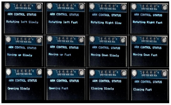 An OLED was connected to the system to show the status of the sensors under no touch, low-force touch, or high-force touch. In addition, a message regarding low- and high-force touch was displayed using an OLED, to guide the user. The user would be informed about the sensor on which a touch was detected and whether the respective motor is moving fast or slow in response to the touch. Figure 6 displays all possible messages on the OLED. These pictures were taken during the keypad testing to show the status of the motors, either moving the arm slowly or rapidly. The top row of Figure 6 displays the status of the motor controlling the left/right movement of the robotic arm. In response to the input provided by the user, the motor can move the arm left or right at a slow or fast speed. All possible statuses of this motor are shown in the top row. The middle row displays the status of the up/down motor that can move in an upward or downward direction at a slow or fast speed. The bottom row represents the status of the jaw, which can open or close at a slow or fast speed, in accordance with the input provided by the user, where a slow movement is due to a low-force touch and fast movement is due to a high-force touch. The presented results show that the CPS touch keypad fabricated from green and facile materials and fabrication techniques are capable enough to control the machines intelligently based on the touch pressure. The obtained results are sensitive to the paper type and the surface roughness of the paper can affect the results. Further, the reported fabrication process is manual and cannot be used for large areas and speedy manufacturing. Future studies can focus on a speedy fabrication process compatible with graphite-based green electronics to achieve high-throughput, large-area fabrication.