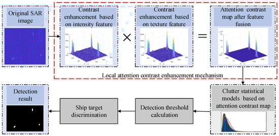 The sea clutter environment is complex and changeable, and there are generally obvious speckle characteristics in SAR images, and small ship targets have weak scattering and are easily hidden in the clutter so that the target detection rate decreases. Therefore, this article proposes an adaptive CFAR detection method for ship targets based on the local attention contrast enhancement. Because the use of a single intensity feature in a single-channel SAR image cannot characterize the local area information well, the texture feature can provide the spatial scattering distribution information of a ship due to the difference of scatterings. For this reason, this article combines the attention contrast difference of intensity and texture features in local regions to enhance feature representation of ship targets. Figure 1 gives the specific flow chart of the proposed detection method.