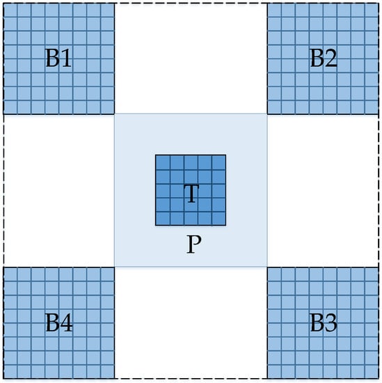 The intensity of ships and sea clutter background is different, in order to describe the local difference of intensity feature, and considering the influence of targets distribution and the side lobes of ships for the detection performance, this article selects a local three-layer sliding window processing with a diagonal-oblique diagonal structure, as shown in Figure 2. The window is mainly divided into three layers, namely target window T, protection window P, and four-neighborhood background windows B1, B2, B3, and B4 on the diagonal-oblique diagonal regions. The window size can be selected according to the ship size.