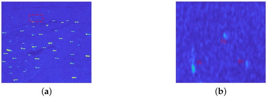 Scene 4 with small ship targets and small target slice. (a) scene 4; (b) small target slice marked by the red dotted rectangle in (a).