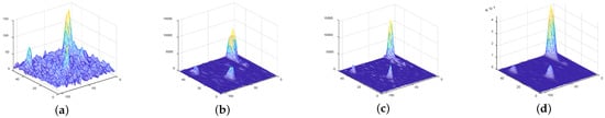 Figure 6a–d show three-dimensional images of Figure 5b, the MVWIE method, the FMPCM method, and the proposed method, respectively. As shown in Figure 6a–d, the small target in the original SAR image has a low contrast with its surrounding clutter, and it is not easy to distinguish from the clutter background. After using the MVWIE method, FMPCM method, and our method, the contrast between ship targets and the clutter background can be improved. However, the suppression effect of MVWIE and FMPCM methods is relatively worse than proposed method, and there is still clutter remaining which will induce false alarms. After the attention contrast enhancement of the intensity and texture features, our proposed method has a better inhibition effect for the clutter background.