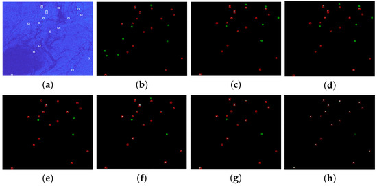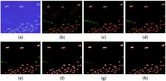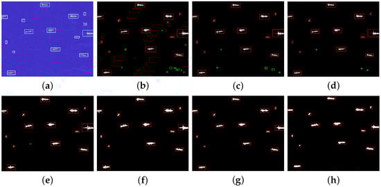 Detection results of different methods for scene 5. (a) original image; (b) CA-CFAR method; (c) GΓD-CFAR method; (d) new LN-2PCFAR method; (e) MVWIE method; (f) FMPCM method; (g) IG method; (h) proposed method.
