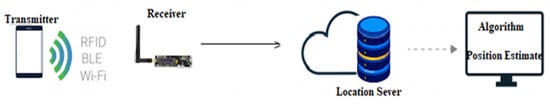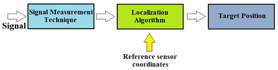 The principle of operation of an indoor positioning system (IPS) uses reference sensor nodes with known positions that send a ranging signal to the mobile device attached to the target. Then, the mobile device perceives the request signals and issues a ranging reply to the reference sensor. At this point, the traveling time of the ranging signal between the transmitter sensor node and the moving target can be calculated. The measured data are transferred to a data center using positioning algorithms, and we can determine the target’s exact position. Therefore, for the localization of unknown nodes, we must first measure some metrics and then use the algorithm to calculate the position itself, as shown in Figure 3 [].