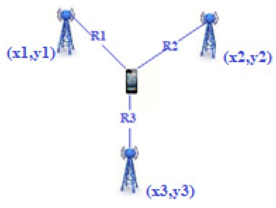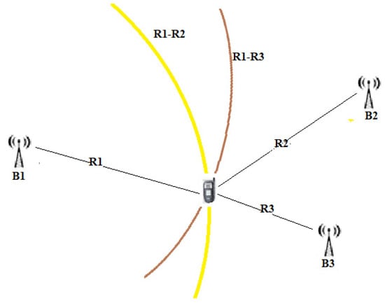With this technique, the arrival times of various reference signals are evaluated, and, from the difference in these times, it is possible to determine the location of the target node []. The difference in signal arrival time at two reference points is used to calculate the distance difference between the target and the reference points []:
