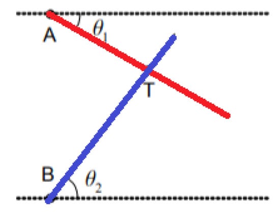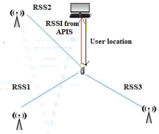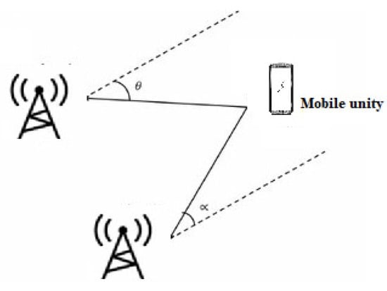 This is based on determining the angles between the propagation direction of the received signal and two or more predetermined references []. At least two AOA measurements from two different references are necessary to estimate a mobile’s position location (Figure 6). To improve accuracy, three beacons or more are used for position estimation. This measurement can be made using directional antennas or antenna arrays. The position estimation is performed by comparing the carrier phase or signal amplitude across multiple antennas. With AOA, no time synchronization between nodes is required. This technique, however, has limitations because, as distance increases, accuracy decreases. It is affected by the phenomenon of multipath and NLOS.