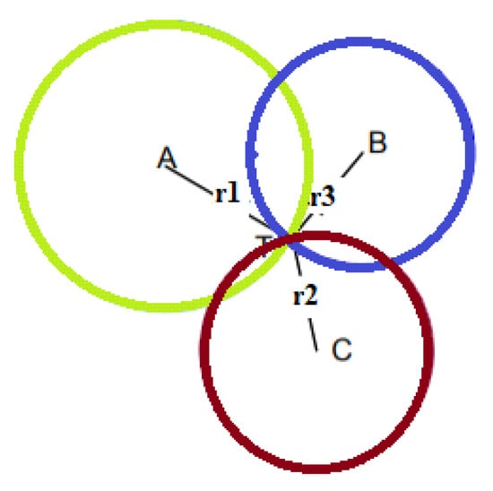 where v is the speed of the signal employed, which is the transmission time of the signal received by node i, and Ri is the distance of signal transmission received by node i. Then, the location of the target is estimated using triangulation. For this method to be effective, it is necessary to have three reference points (also called anchors). Graphically representing the system, the node of which we want to calculate the coordinates would be given by the intersection of the three circumferences with the center of the reference nodes (Figure 4). In that case, we would have the following equations: