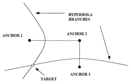 Unlike the TOA, the transmitted messages do not convey a timestamp because the difference in the time of receipt is already sufficient information to guarantee localization. Instead, through the multilateration technique, by comparing the arrival times of the signals in pairs, it is possible to build a system of hyperboles whose intersection determines our position (Figure 5). Unlike TOA, in the TDOA method, not all nodes need to be synchronized; it is sufficient that the anchor nodes are synchronized.