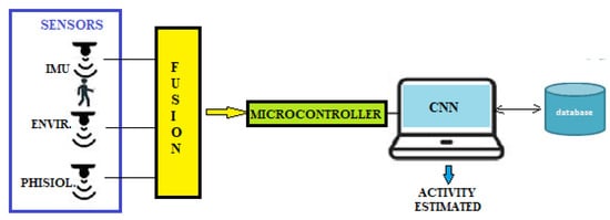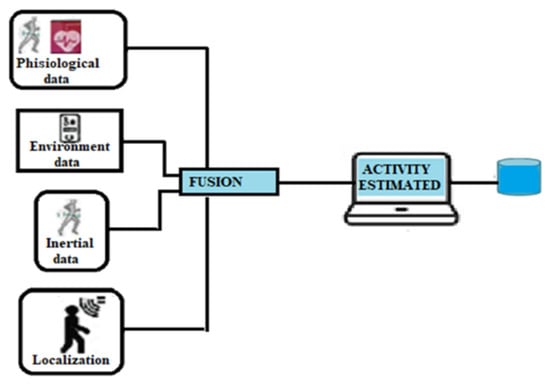 Human activity recognition (HAR) is the scientific field that studies the identification of movements or actions performed by a person through the detection of signals sent by wearable sensors or smartphones or through video frames or images. The activities are carried out indoors, such as walking, sitting, stairs, and standing. It is also essential to know where the practical activities are carried out. In interpreting human movement, computer technology and artificial vision are used []. HAR has multiple applications such as surveillance, anti-terrorist security, lifelogging, and assistance. These systems have proven very useful in providing efficient home care for the elderly and indoor tracking systems. The percentage of older adults currently continues to grow, consequently determining a need for assistance for those subjects who, losing autonomy and wanting to continue living in their own home, require continuous support in real time. Therefore, it becomes essential to note what the older adult does regarding daily activities. The basic principle is to monitor older people at home or in a nursing home. The system must be able to detect anomalies or deviations in daily activities that are indicative of a decline in people’s capabilities. It should also be able to detect emergencies []. A positioning system is necessary to ensure these systems’ effectiveness. The developments in artificial intelligence, wireless communication systems, and nanotechnologies have allowed the creation of intelligent home care systems, avoiding hospitalization, with an evident reduction in healthcare costs. The HAR system has three main components: