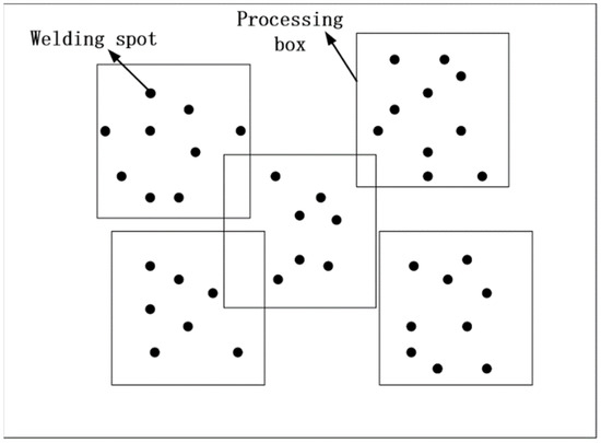 In the system constructed in this paper, the theoretical processing range of the laser passing through the galvanometer is 50 × 50 mm, and the processing frame represents the frame selection area of the processing range. When the position of the solder joints in the circuit board exceeds the processing range of the galvanometer, it is necessary to plan the corresponding movement axis to move the points to complete the processing coverage of all solder joints. The full coverage of the solder joints of the processing frame is shown in Figure 2.