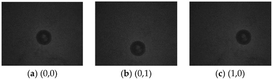 The system is used to mark a point on the marker plate when the galvanometer is deflected towards the origin. The pixel position of the center of the circle in the image is identified by moving the galvanometer, and the corresponding galvanometer motion position is recorded. The motion of galvanometer makes the camera shoot at (0,0), (1,0) and (0,1), as shown in Figure 7. The conversion relationship between the galvanometer coordinate system and the pixel coordinate system is calculated through three points, and the calculation results are as follows: