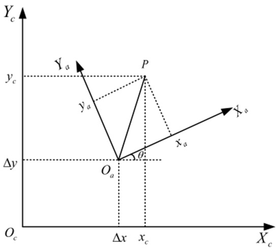 Because the laser optical path in the actual system is coaxial with the visual optical path, it can be equivalent to the pixel coordinate system. At the same time, the height of the machining surface and the luminescence point remain unchanged during the machining process, so the machining coordinates of the galvanometer can be converted into two-dimensional coordinates. The camera needs to change its position with the movement of the galvanometer, so the deflection of the galvanometer can be used to carry out the calibration process. The relationship between the pixel coordinate system and galvanometer processing coordinate system is shown in Figure 6.