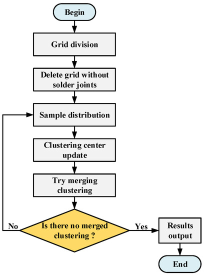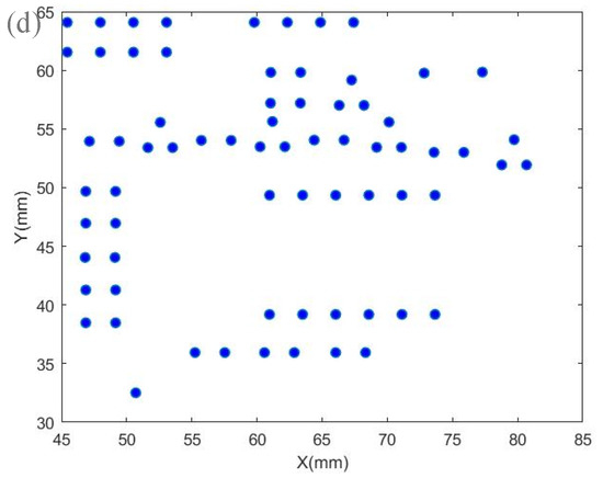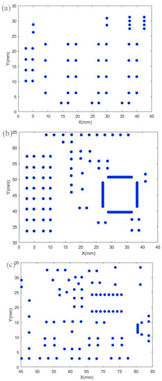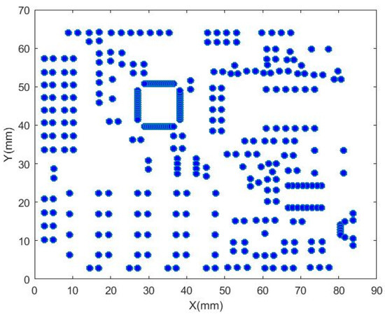 The improved K-means clustering algorithm is used to generate a processing frame for solder joints in circuit boards, which requires that the smallest processing frame can completely cover the solder joints in circuit boards. A sample with a circuit board size of 87 mm × 68 mm is selected for testing. The distribution of solder joints on the circuit board is shown in Figure 18.