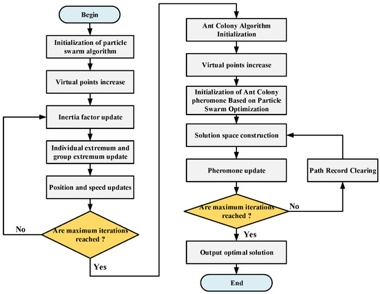 The ant colony algorithm can find feasible solutions in a short time and can also combine the advantages of other algorithms to improve the overall performance of the algorithm. However, when the scale of the problem becomes larger, the ant colony algorithm tends to fall into the local optimal solution, and the convergence speed slows down [22]. Particle swarm optimization (PSO) is a random search algorithm proposed by simulating bird foraging. The particle swarm algorithm has strong local search ability in the early stage. The initial distribution of pheromones in ant colony algorithm is set by the particle swarm optimization algorithm, which can effectively solve the problem of low search efficiency in the initial case of the ant colony algorithm. According to this characteristic, the combination of particle swarm optimization and the ant colony algorithm can improve the effect of path optimization.