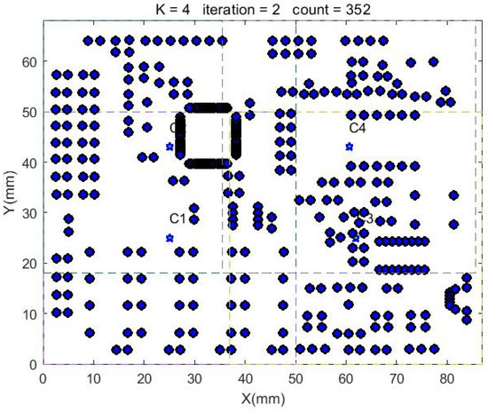 In the improved clustering algorithm, the grid is divided into 4 × 3 grids to set the initial cluster center, and then the algorithm flow is started. When there are no merged processing frames, the algorithm stops and outputs the corresponding results. The number of processing frames generated by the improved clustering algorithm in the test circuit board is four, and the corresponding processing frames are generated as shown in Figure 20. The machining frame generated after testing can cover all solder joints, and the corresponding center points of each machining frame are shown in Table 5.