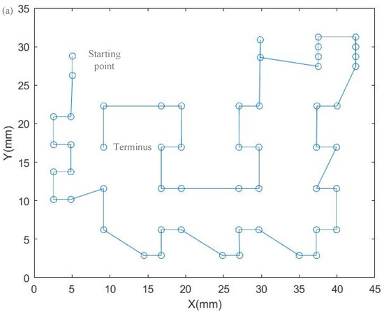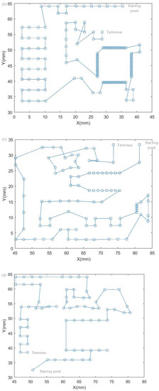 Compared with the ant colony algorithm, the hybrid algorithm has better solution accuracy and shorter running time during the solution process. The hybrid algorithm is used in the system to plan the solder joints in each processing frame area, as shown in Figure 23.