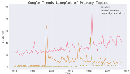 - Google. Google Trends Topics: Privacy, Edward Snowden, Cambridge Analytica. Available online: https://trends.google.co.uk/trends/explore (accessed on 5 October 2022).