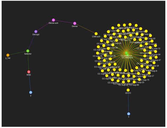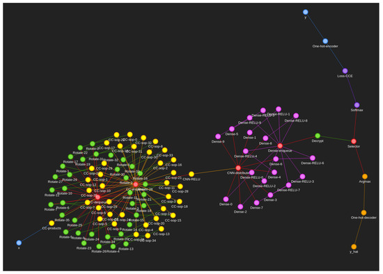 Figure 3. Fashion-MNIST computational graph we call “sphira”, showing the colour-coded graph and the respective nodes used to train/compute Fashion-MNIST using our neuronal firing algorithm. Blue represents the input and input transformation circuit that deals with passing the signals into the neural network in a way it is expecting them. Yellow represents the convolutional neural network components where one filter neuron passes multiple output cyphertexts to a plethora of summing nodes. Pink represents the fully connected dense layer for each class. Purple represents the loss calculation circuit necessary for backpropagation. Orange represents the output/prediction circuit. Red represents the generic glue operations necessary to bind components together. Green represents the encryption specific nodes such as decryption, rotation, and encryption. An interactive version of this graph is available in our source code documentation so that clusters of nodes can be peeled apart for investigating individual nodes and connections [28].