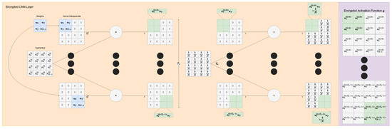 Encrypted convolutional neural network (CNN). This is a particularly unusual implementation since there can be no summing of the filters. Instead, this sum is commuted in the case where the filter operates on an input that is a single cyphertext (i.e., not a composite of multiple cyphertexts). Please see our documentation for closer detail [28].